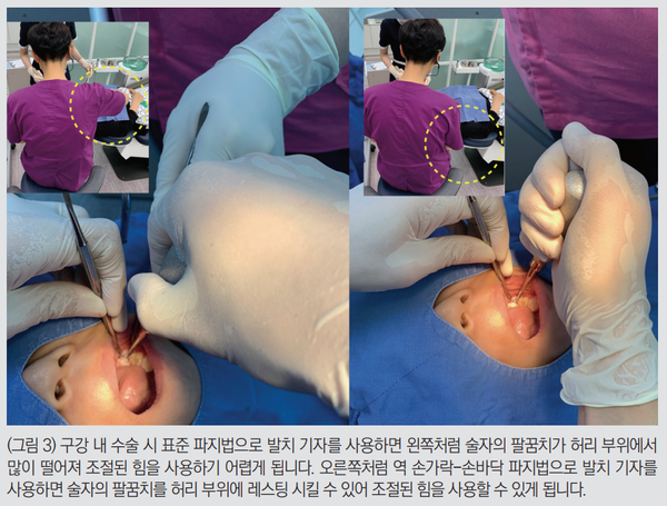 술자의 위치와 자세, 환자의 위치와 자세 그리고 수술 필드의 높이와 깊이 등을 종합적으로 고려했을 때 ‘역 파지법’이 구강 내에서 시행되는 치과 수술, 구강외과 수술에 편리하고 안전한 경우가 많고 보다 인체공학적인 파지법이라고 할 수 있습니다.