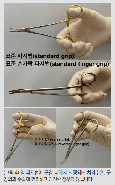 ‘작동단’, ‘자루’ 및 ‘손잡이’ 부위가 일부 또는 모두 직선형인 전치부, 구강외 수술용 수술 기구들을 구강내, 구치부에서 사용하려면 대개 역 파지법(역 손가락 파지법 또는 역 손가락-손바닥 파지법)으로 수술 기구를 다뤄야 합니다.