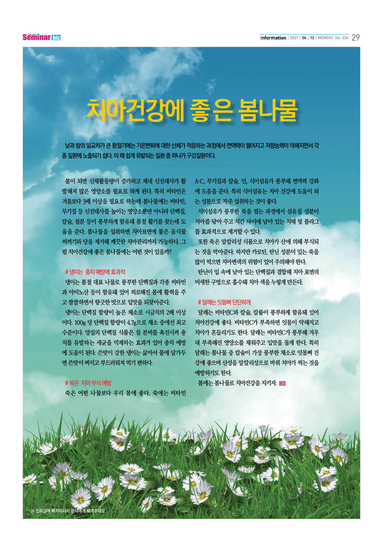 봄이 되면 신체활동량이 증가하고 체내 신진대사가 활발해져 많은 영양소를 필요로 하게 된다. 특히 비타민은 겨울보다 3배 이상을 필요로 하는데 봄나물에는 비타민, 무기질 등 신진대사를 높이는 영양소뿐만 아니라 단백질, 칼슘, 철분 등이 풍부하게 함유돼 봄철 활기를 찾는데 도움을 준다. 봄나물을 섭취하면 치아표면에 붙은 음식물 찌꺼기와 당을 제거해 깨끗한 치아관리까지 가능하다. 그럼 치아건강에 좋은 봄나물에는 어떤 것이 있을까?