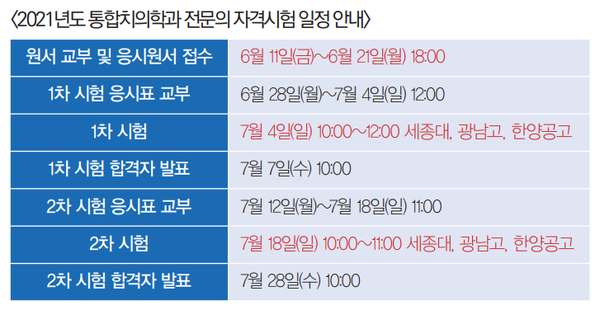 올해 통합치의학과(이하 통치) 전문의 자격시험은 1차 7월 4일(일), 2차 7월 18일(일)에 세종대와 광남고 그리고 한양공고에서 실시된다.