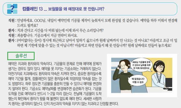 치과 컴플레인 사례집 컴플레인 슈팅은 20년간 치과를 운영해 온 이도훈 원장의 경험을 토대로 솔루션을 제공해 주는 책이다. 대한나래출판사의 컴플레인 슈팅 책 일부를 본 지에 게재해 치과경영에 대한 꿀팁을 주고자 한다. (편집자 주)