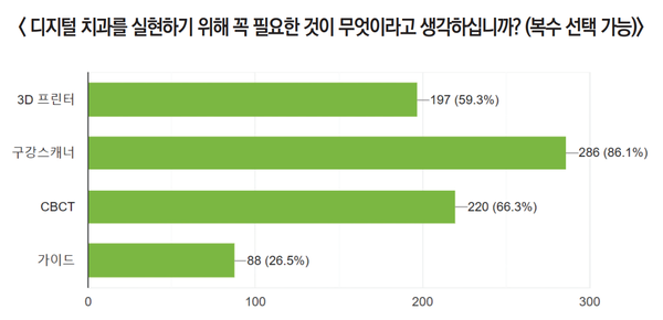 ‘디지털 치과를 실현하기 위해 꼭 필요한 것이 무엇이라고 생각하는가’에 대한 질문에는 ‘구강스캐너가 필요하다’는 응답자가 86.1%로 압도적 1위를 차지했다.