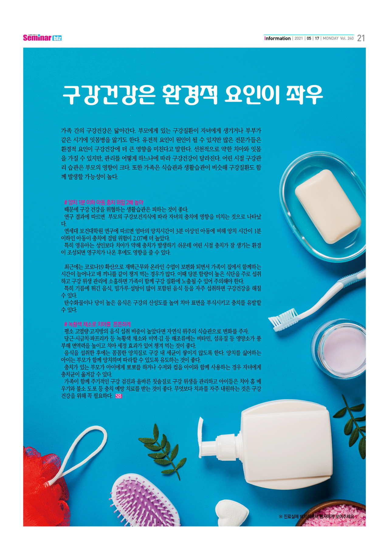 선천적으로 약한 치아와 잇몸을 가질 수 있지만, 관리를 어떻게 하느냐에 따라 구강건강이 달라진다. 어린 시절 구강관리 습관은 부모의 영향이 크다. 또한 가족은 식습관과 생활습관이 비슷해 구강질환도 함께 발생할 가능성이 높다.