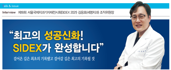 제18회 서울국제치과기자재전시회(SIDEX 2021)와 서울시치과의사회 창립 96주년 기념 2021년 국제종합학술대회가 다음달 4일부터 6일까지 서울 코엑스에서 개최된다. 김응호 SIDEX 조직위원장은 일에 있어서는 반드시 성공의 신화를 완성하는데 정평이 나 있다. 때문에 이번 SIDEX 2021에 대한 기대도 상당하다. 8개 전국치과대학 재경동창회 회장을 역임했던 경험이 있는 김응호 조직위원장은 지방대학의 연합체인 E-DEX를 성공적으로 개최하기도 했다. 김응호 조직위원장을 만나 그 성공예감을 감지했다. (편집자주)