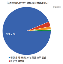 ‘정관에 의거 회장과 부회장 모두를 재선출해야 한다’는 응답에 281명(93.7%)으로 가장 많았다. ‘회장만 재선출해야 한다’는 10명(3.3%)이었고 현재 부회장 중 한 명을 회장으로 선출해야 한다는 응답자는 6명(2.0%)에 불과했다.
