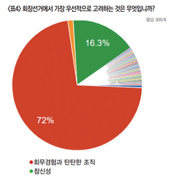 ‘회장선거에서 가장 우선적으로 고려하는 것이 무엇인가?’를 묻는 질문에는 1위가 회무경험과 탄탄한 조직(72.0%), 참신성(16.3%), 출신학교는 0.7%에 불과했다. <표 4>