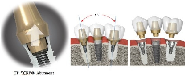 SCRP는 어버트먼트의 연결 부분이 Semi-Hex 구조로 돼 있어 20˚ 이내로 임플란트가 식립된 경우 멀티플 케이스에서도 탈부착이 간편한 것이 특징이다.