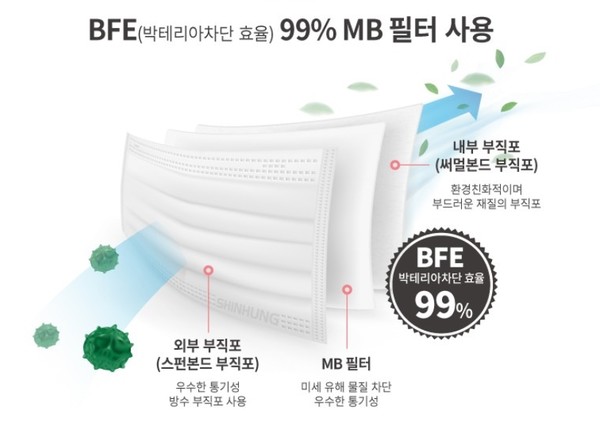 신흥덴탈마스크는 BFE 99% MB 필터를 사용해 공기중 미세 유해 물질을 여과해 완벽하게 차단하고, 통기성이 우수한 MB필터를 사용해 BFE(박테리아 차단 효율) 99% 를 자랑한다.