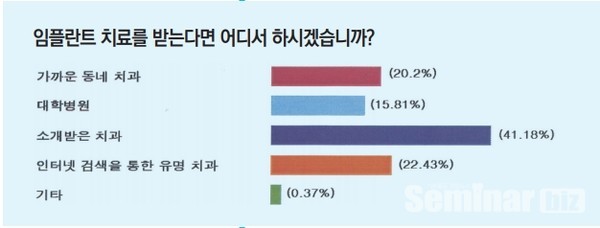 “임플란트 치료를 받는다면 어디서 하시겠습니까?”라는 질문에 1위가 소개받은 치과(41.8%), 인터넷검색을 통한 유명치과 (22.43%), 가까운 동네치과(20.2%), 대학병원(15.81%) 순이었다.