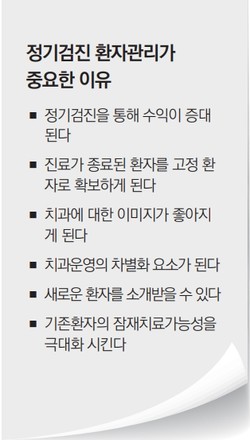 최근 치과수익급증과 더불어 치과경영이 예전과 같지 않다고들 한다. 그러므로 치 료가 끝난 환자라 하더라도 계속적인 정기검진을 통해 환자는 건강한 구강상태를 보 존하며 치과의사는 고정적 환자를 확보하여 안정된 치과운영을 할 수 있다.
