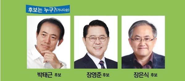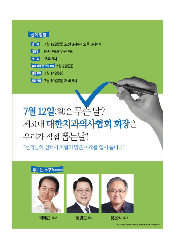 오는 7월 12일(월) 진행되는 대한치과의사협회장 보궐선거에 공식 출마선언을 한 후보는 3명이다.(가나다순) 前 울산지부장을 역임했고 직선제추진위원장을 역임한 박태근 후보와 지난 선거에서 출마했던 前 대한치과의사협회 부회장을 역임한 장영준 후보, 그리 고 現 제주지부장을 맡고 있는 장은식 후보 3명이다.
