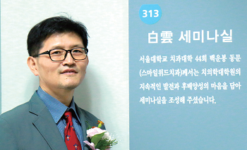 서울대학교 치의학대학원(원장 이재일)은 지난 7월 서울대학교 치과대학 44회 졸업생 백운봉 동문(스마일 위드치과 원장)으로부터 1억 원을 기부 받아, 교육동 313호를 전자교탁 및 A/V시설을 구비한 종합세미나실로 만들고 대학원생의 교육과각종 세미나 등의 연구활동에 활용할 공간을 마련해 백운세미나실로 명명하고 현판식을 가졌다.