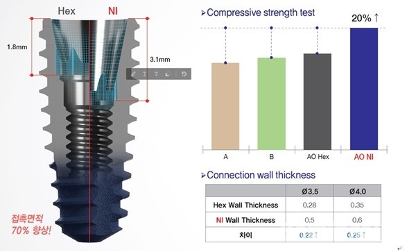 AnyOne NI는 mount Free 디자인으로 AnyOne 대비 Abutment 접촉 면적을 70% 이상 향상 시켰다. 또한, Connection wall thickness 가 HEX 모델 대비 0.22 0.25 두꺼워져 Compressive strength test 결과 기존 HEX 제품 대비 20% 향상된 강도를 보여준다.