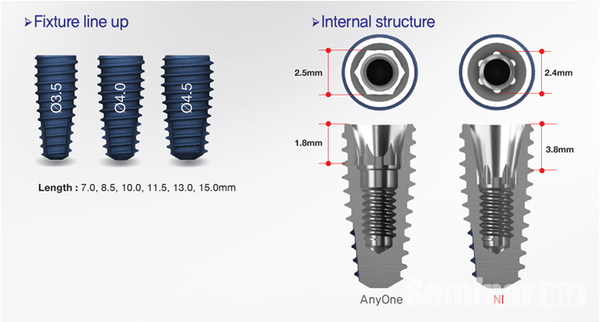 특히 이번에 출시된 AnyOne NI(Non Index)은 좁은 골 폭에서 GBR없이 작은 직경을 선택해야만 할 경우나 강한 저작력에 의한 파절이 우려될 경우에 사용할 수 있는 장점이 있다.