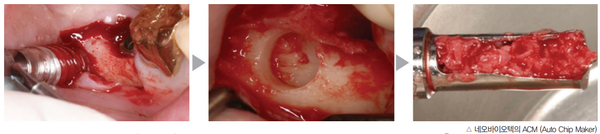 ACM은 피질골을 조각뼈 형태로 채취할 수 있는 제품으로 전용 스타퍼(4mm)로 안전하게 10초 이내에 1cc의 골 채취가 가능하다. GBR시술에 필요한 bone을 환자의 구강 내에서 바로 채취할 수 있다. 또한 안전하고 빠르게 자가골을 채취한다는 점에서 합성골이나, 이종골 사용에 따른 감염우려와 면역 거부반응들을 걱정하는 환자의 부담을 없애줄 수 있다.