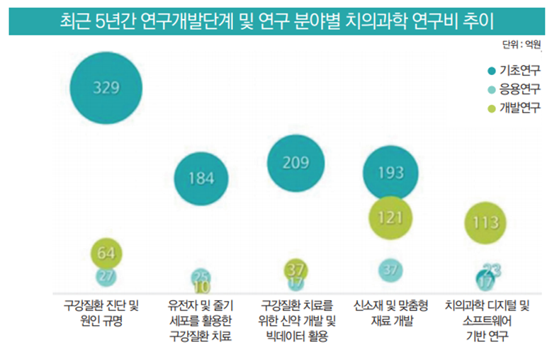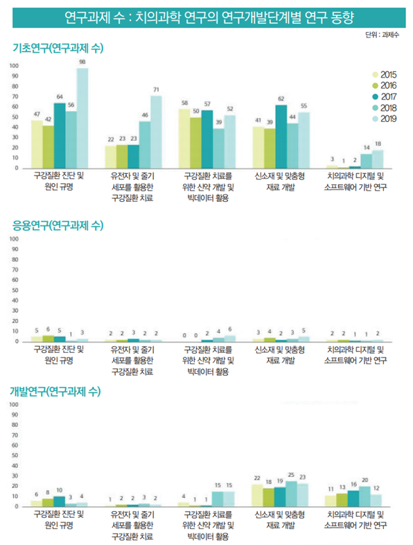이에 반해 치의과학 연구는 대부분 ‘대학’에서 수행하는 ‘기초연구’에 치중돼 있다. 응용연구가 부족한 상태에서 민간 기업에서 ‘개발연구’를 수행하고 있어 특허와 같은 새로운 기술 개발 부분이 미비한 것이 문제점으로 지적된다.