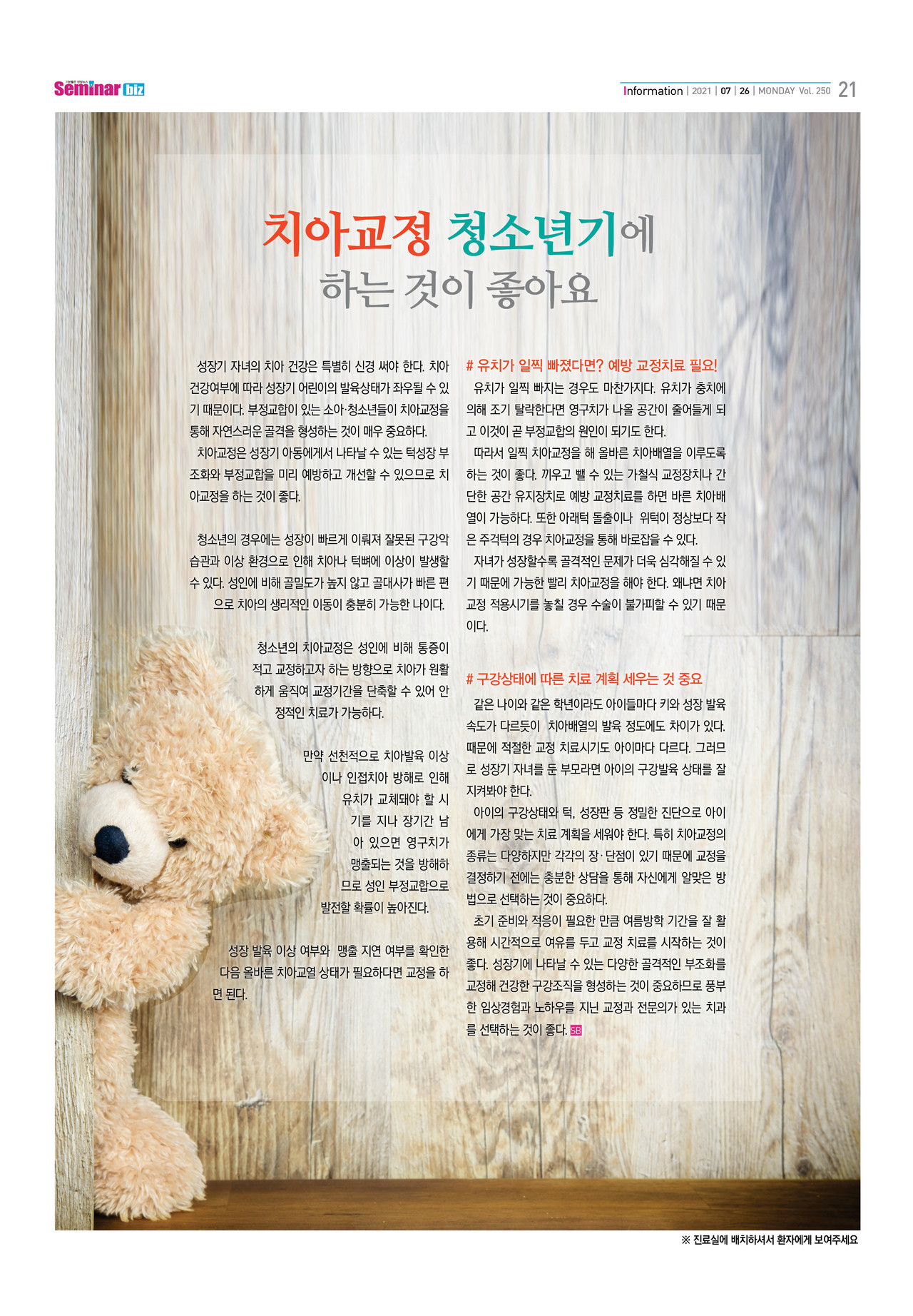 성장기 자녀의 치아 건강은 특별히 신경 써야 한다. 치아 건강여부에 따라 성장기 어린이의 발육상태가 좌우될 수 있기 때문이다. 부정교합이 있는 소아·청소년들이 치아교정을 통해 자연스러운 골격을 형성하는 것이 매우 중요하다.