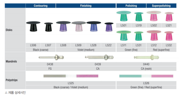 거칠기에 따라 디스크의 종류가 COARSE - MEDIUM - FINE - SUPER FINE 4가지로 나눠져 있다. 컬러 코드가 돼 있어 구분하기에도 쉽다. 디스크 사이즈는 STANDARD와 MINI 두 종류가 있으며 MINI 사이즈의 디스크는 크기가 작고 유연해서 Interproximal 부분에 잘 들어가기 때문에 사용하기 편리하다. POLYSTRIP은 인접면 연마에 사용할 수 있으며 거칠기에 따라 색상이 구별되며 디스크와 색상을 통일했다.