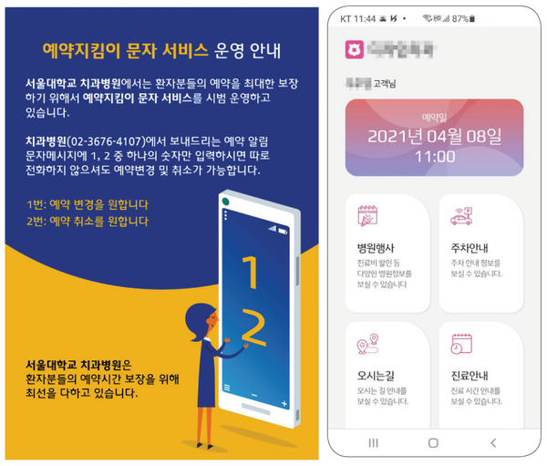치과에서 보내주는 예약알림 문자서비스에 ‘1번 예약변경을 원합니다’, ‘2번 예약취소를 원합니다’ 중 하나의 숫자를 입력하면 치과에 별도로 전화하지 않아도 예약변경이나 취소가 가능한 시스템이다.