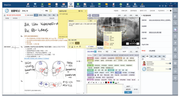 또한 접수목록과 문진, 전자차트, 펜차트, 영상 등 진료 내역을 모바일로도 손쉽게 확 인할 수 있어 편리하다. OneClick은 또 포털사이트 실시간 예약과 수납 및 통계 등 치과관리에 편리한 다양한 기능이 탑재돼 있다. 다양한 디지털 솔루션과 연동이 가능하다.