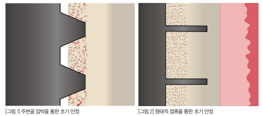그 첫번째로 수술적 고정이라함은 우리가 흔히 이야기하는 초기안정성이라고 하는 것인데 초기 안정성이라 함은 임플란트의 식립 후 미세 동요도가 없는 상태라고 할 수 있으며 이러한 초기 안정성을 얻는 방법에는 최종식립 torque값으로 표현되는 고정력을 통해 고정을 얻는 방법 [그림 1]과 형태적 접촉을 통해 미세 동요가 없이 유지되는 방법 [그림 2]이 있다.