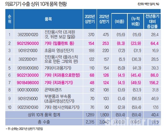 2위는 임플란트로 2.5억 달러(+64.4%)였다. 코로나19 관련 진단용 제품은 여전히 전체수출의 많은 부분을 차지하고 있다.