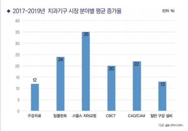2017년부터 2019년까지 치아 교정과 임플란트의 평균 증가율은 각각 35% 및 24% 로 치과기구 시장에 가장 빠른 성장세를 보였다.