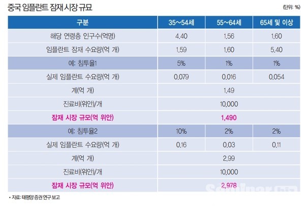 태평양 증권 연구보고에 따르면, 진료비 1만 위안/개 기준, 중국에서 35~54세의 임플란트 침투율이 5%~10%, 55~64세의 임플란트 침투율이 1%~2%, 65세 이상의 임플란트 침투율이 1%~2%를 적용하면 임플란트의 잠재 시장규모는 1,500억 위안에서 3,000억 위안을 달성할 것으로 예상된다.