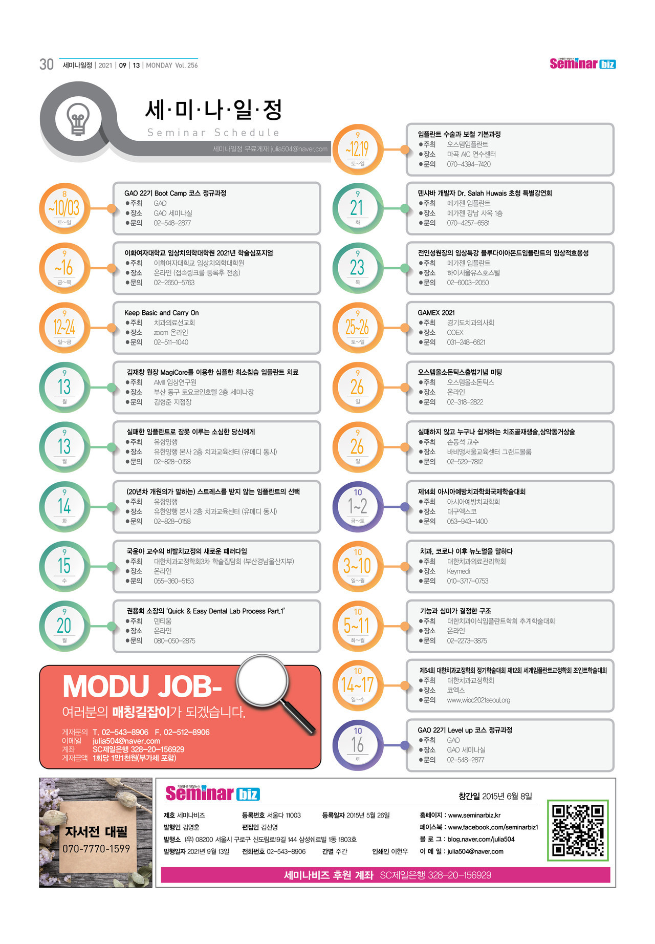 좋아요0훈훈해요0슬퍼요0후속기사 원해요0 [세미나일정] 대한소아치과학술대회 외~ [학술세미나일정] 키워드 #이화여대임상치의학대학원 학술심포지엄 #김재창원장 #유한양행웨비나 #치조골재생술 #아시아예방치과학회국제학술대회 #대한치과의사협회 #치과의사 #치과 #치과신문세미나비즈 #세미나비즈 세미나비즈 webmaster@seminarbiz.kr 다른기사 보기 저작권자 © 덴탈뉴스 무단전재 및 재배포 금지 당신만 안 본 뉴스 [알파베러정재욱대표] 좋은 제품 검증된 제품만 모은 알파베러 유한 evertis 임플란트 성공 위한 워크샵 진행 “미용치과 안티에이징이 치과의 블루오션” 덴탈스튜디오, 블랙니들홀더 출시 서울대학교치과병원, 키르기스스탄 장애 어린이위한 사랑의 의료봉사 펼쳐 연송캠퍼스 개관10주년 기념식 및 SID 명예의 전당 제막식 네오바이오텍, 즉시로딩 임플란트 ALX-IT 11월 세미나 전국 진행 [알파베러정재욱대표] 좋은 제품 검증된 제품만 모은 알파베러 개의 댓글 회원로그인 작성자 비밀번호 댓글 내용입력 댓글 정렬 최신순 추천순 답글순 BEST댓글 BEST 댓글 답글과 추천수를 합산하여 자동으로 노출됩니다. 닫기 더보기 댓글삭제 삭제한 댓글은 다시 복구할 수 없습니다. 그래도 삭제하시겠습니까? 비밀번호 닫기 댓글수정 댓글 수정은 작성 후 1분내에만 가능합니다. 본문 / 400 비밀번호 닫기 내 댓글 모음 닫기 주요기사 중국 의료기기 1등급 인허가 취득 점빵치과 고민! 한자리서 해결 완성도높은 투명교정 솔루션 나노라이너 치과의사들의 만성고민 해결 신경치료가 혈당과 지방대사까지 개선 골이식 전략과 덴티움 제품 활용 노하우 공유