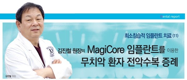 필자는 다년간 완전 무치악 환자에게 최소한의 연조직 손상, 잔존 치조골의 최소한의 삭제, 치조골 이식의 최소화 및 최소한의 수술횟수를 지향하는 최소침습용 임플란트 MagiCore를 사용하여 고정성 전악 수복 치료를 진행해 왔다.