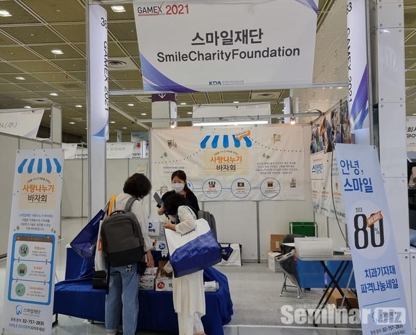 재단법인스마일(이사장: 김경선)은 지난 9월 25일(토), 26일(일) COEX에서 개최된 GAMEX 2021에 저소득 중증 장애인 치과진료비 마련을 위한 『2021 사랑나누기 바자회』를 진행했다.