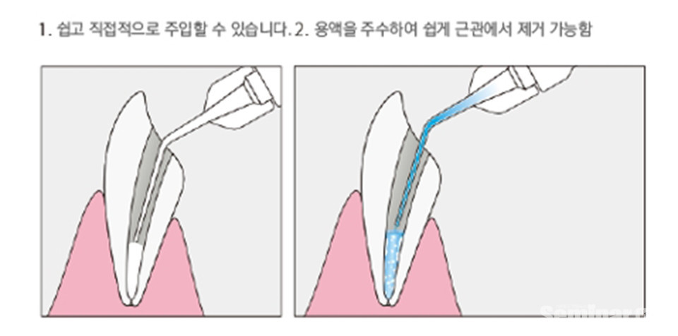 특히 감염 근관 치료 시, 지속적인 삼출을 보이는 근관 CASE에 사용할 수 있으며 Calicium Hydroxide의 효과가 오래 지속된다. 니들은 유연한 플라스틱 재질로, 유치와 Curved 된 root canal에 적용 가능하고 원하는 앵글로 구부릴 수 있어 사용하기 편리한 것도 장점이다.