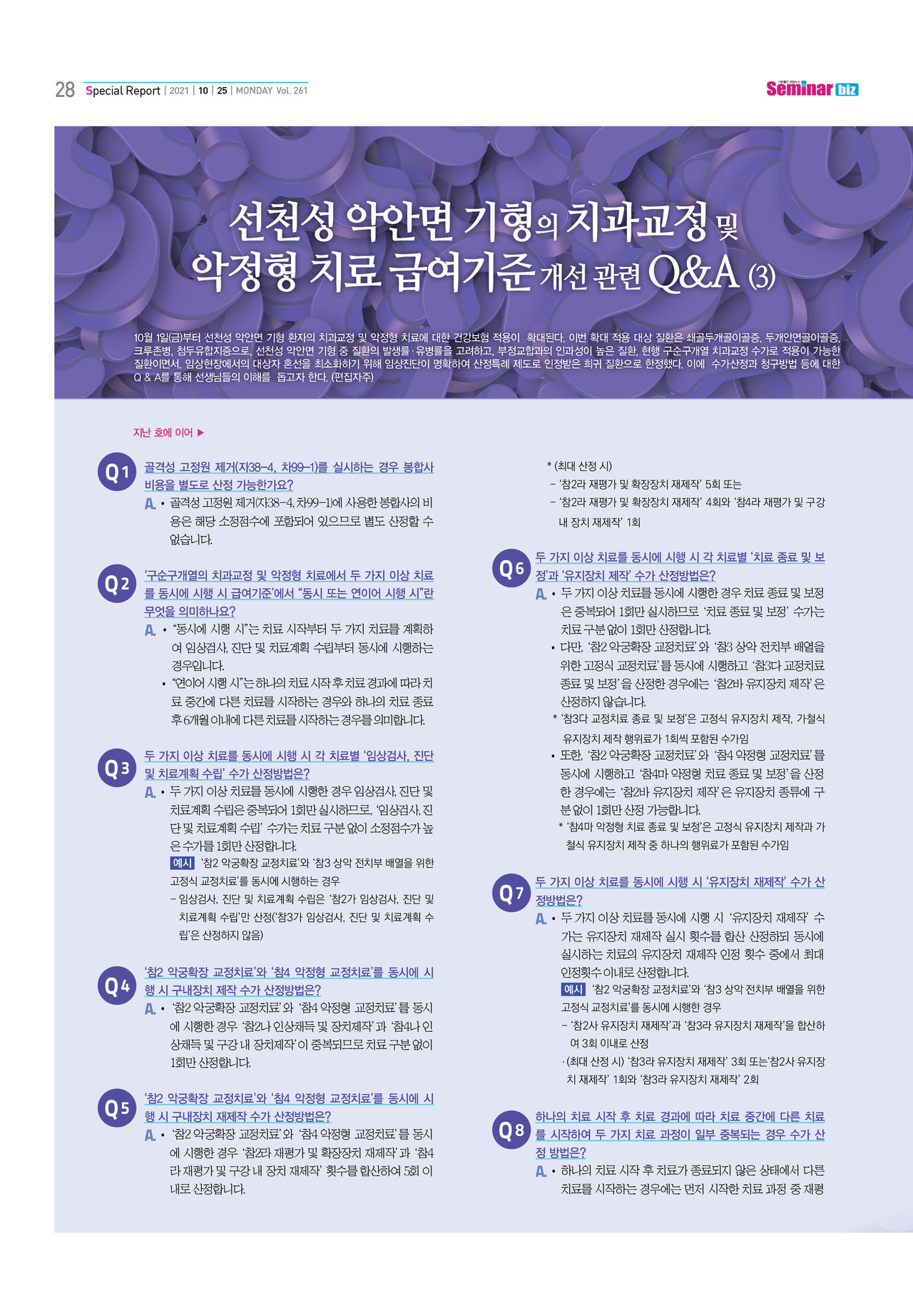 10월 1일(금)부터 선천성 악안면 기형 환자의 치과교정 및 악정형 치료에 대한 건강보험 적용이 확대된다. 이번 확대 적용 대상 질환은 쇄골두개골이골증, 두개안면골이골증, 크루존병, 첨두유합지증으로, 선천성 악안면 기형 중 질환의 발생률·유병률을 고려하고, 부정교합과의 인과성이 높은 질환, 현행 구순구개열 치과교정 수가로 적용이 가능한 질환이면서, 임상현장에서의 대상자 혼선을 최소화하기 위해 임상진단이 명확하여 산정특례 제도로 인정받은 희귀 질환으로 한정했다. 이에 수가산정과 청구방법 등에 대한 Q & A를 통해 선생님들의 이해를 돕고자 한다. (편집자주)