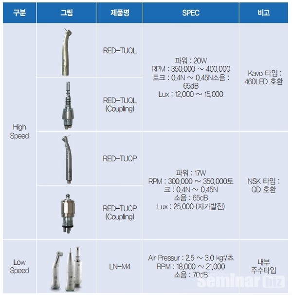 로우 핸드피스는 18,000 ~ 21,000 rpm 제품으로, 벌집모양 공기 모터 자가 회전 방식의 특허 기술로 설계됐다. 따라서 2주 간격으로 내부 세척을 해 주면 된다.