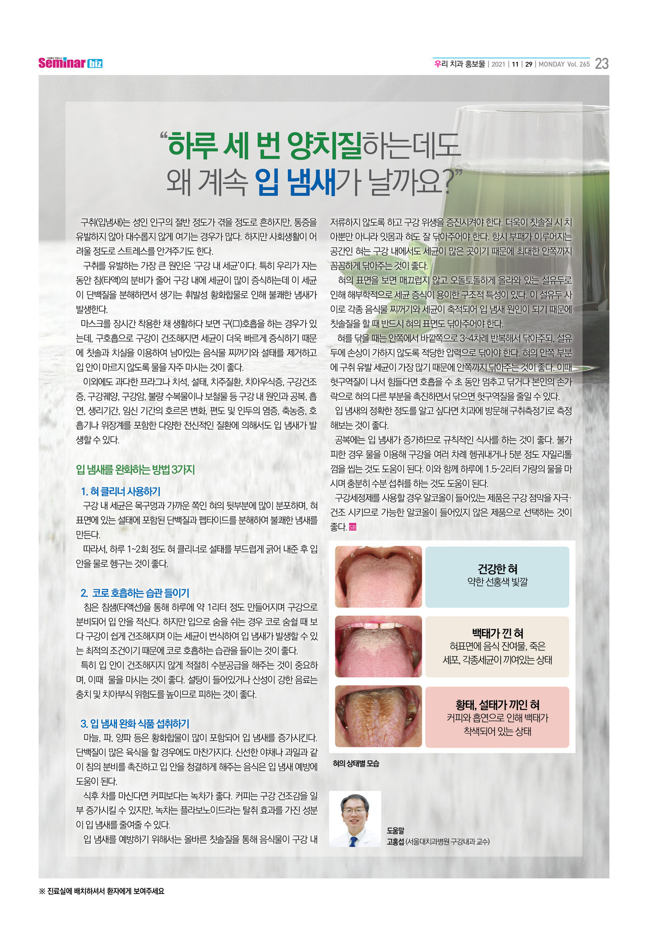구취(입냄새)는 성인 인구의 절반 정도가 겪을 정도로 흔하지만, 통증을 유발하지 않아 대수롭지 않게 여기는 경우가 많다. 하지만 사회생활이 어려울 정도로 스트레스를 안겨주기도 한다.