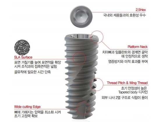 또한 시멘트 사용 없이 간단히 구강 내에 장착할 수 있기 때문에 술자와 환자의 만족 도가 매우 높은 시스템이며 Screw 유지형 보철 방식의 특성상 유지 보수가 매우 편리하다는 장점이 있다.