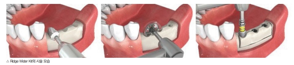 Ridge Wider Kit 사용법을 살펴보면 우선 Narrow Ridge의 임플란트 식립위치를 확인 하고 식립할 위치에 Bone Trimmer를 이용해 Narrow Ridge 부분을 평평하게 다듬는다.
