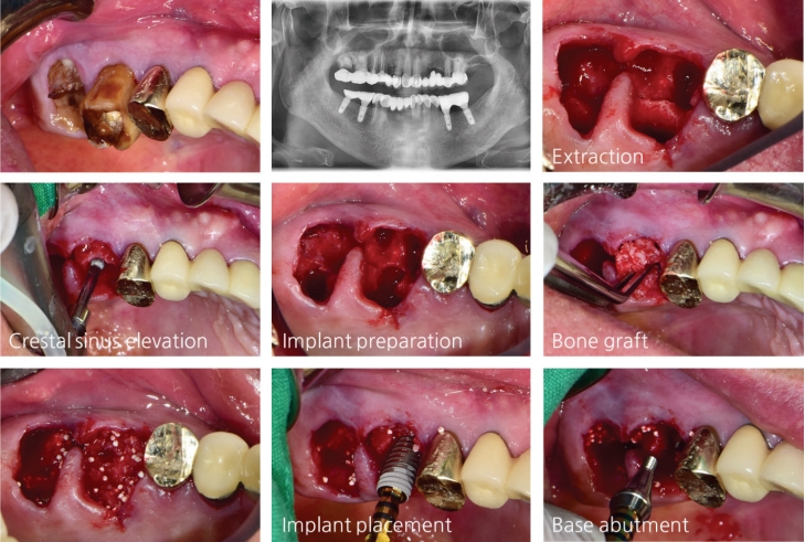 #16, 17 부위의 발치 후 즉시 식립과 골이식을 동반한 상악동 거상 술을 동시에 시행하였다. 임플란트 식립 후 base abutment를 40N의 torque로 연결하였다.