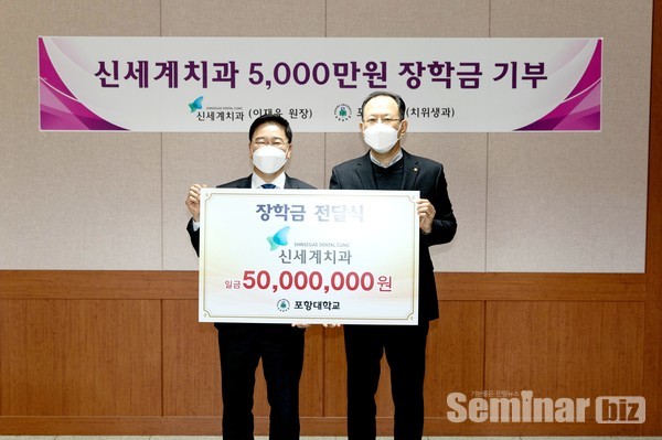 이날 전달된 장학기금은 포항대학교 치위생학과에 5년간 5000만원을 출연해 학생들의 학업 증진에 도움이 될 예정이다.
