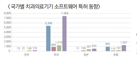 ‘16년 전 세계 치과의료기기 및 소프트웨어 특허중 국내 특허는 174건으로 전체의 1.8%에 불과하며, 이는 미국, 일본, 유럽에 비해 매우 낮은 수준이다.
