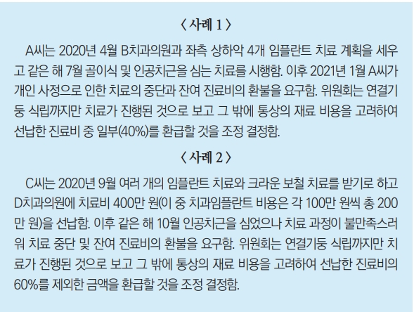이 두 사례에서 치과는 치료과정에 문제가 없다며 환불이 불가하거나, 위원회의 결정보다 적은 금액의 환불만 가능하다고 주장했다. 그러나 위원회는 치과 임플란트는 한 번의 치료과정이 아니라 장기간에 걸쳐 진단과 치료계획, 고정체 식립술, 보철 수복 등의 단계적 의료행위가 순차적으로 적용돼야 치료가 완료되는 시술이므로, 치료가 완료된 단계에 해당 하는 비용만을 공제하는 것이 합리적이 라고 판단했다.