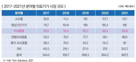 의료기기 시장 세부분야별로 보면, 영상진단기 분야, 소모품, 치과 분야의 시장규모가 크고 또한 증가율도 매우 높으며 세부 분야별 시장 규모는 표와 같다.