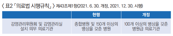 이는 감염관리위원회와 감염관리실 설치의무 의료기관의 범위가 「의료법 시행규칙」 개정으로 확대됨에 따라 감염예방·관리료 수가산정기준이 확대 적용되도록 개선했다.