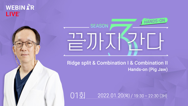 이번 웨비나는 끝까지간다 시즌 1, 2를 진행한 전인성(서울H치과) 원장이 연자로 나선다. 전 원장은 이날 ‘Ridge split & Combination I & Combination II Hands-on’을 주제로 청중을 만난다.