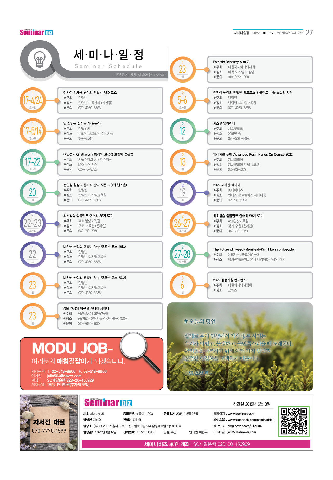 [학술세미나일정]서울대학교 치의학대학원 치의학교육원수원 세미나일정외 [학술세미나일정] 제13기 시니어 구강관리전문가 과정 [학술세미나일정] 김가네 솔루션 외 [학술세미나일정] 가톨릭대학교 치과학교실 학술강연회 외 [덴탈빈] 치과 최초 오픈마켓 덴탈빈몰 오픈