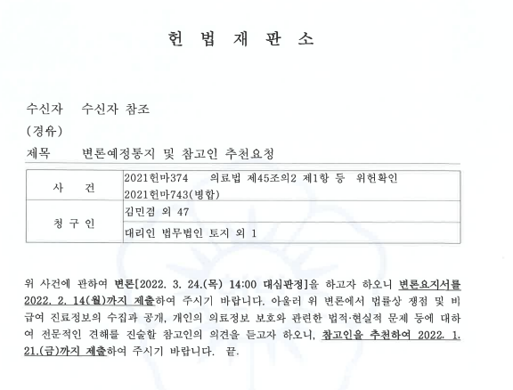 또한, 지난 6월 25일 법무법인 의성을 통해 청구했다. 그러나 7월 20일에 심판회부된 2021헌마743 ‘의료법 제45조의2 제1항 의료법 제45조의2 제2항 의료법 제45조의2 제3항, 등 헌법소원 사건과 병합되어 진행된다.