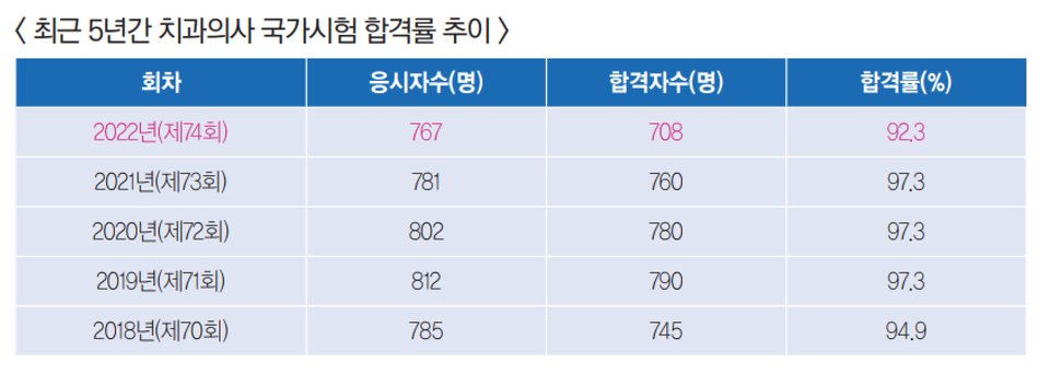 제74회 치과의사 국가시험은 전체 767명의 응시자 중708명이 합격해 92.3%의 합 격률을 기록했다.