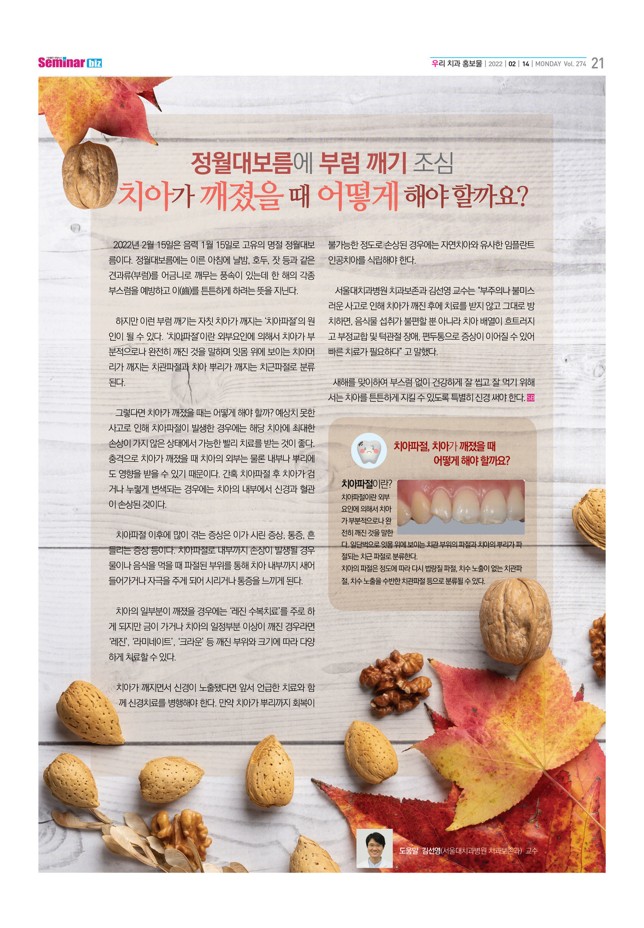 022년 2월 15일은 음력 1월15일로 고유의 명절 정월대보름이다. 정월 대보름에는이른 아침에 날밤, 호두, 잣등과 같은 견과류(부럼)를 어금니로 깨무는 풍속이 있는데 한해의 각종 부스럼을 예방하고 이(齒)를 튼튼하게 하려는뜻을 지닌다.