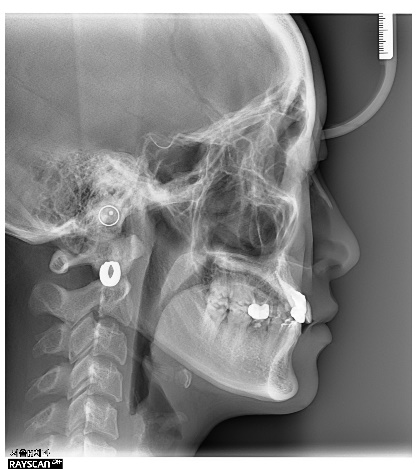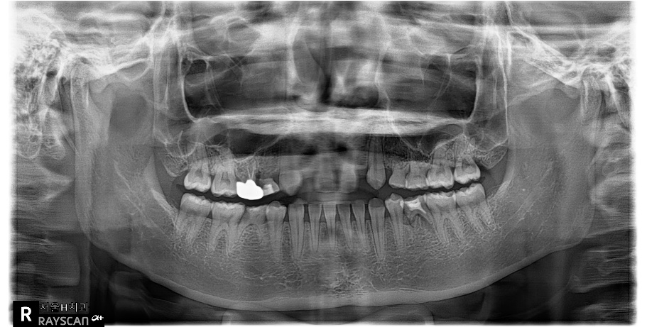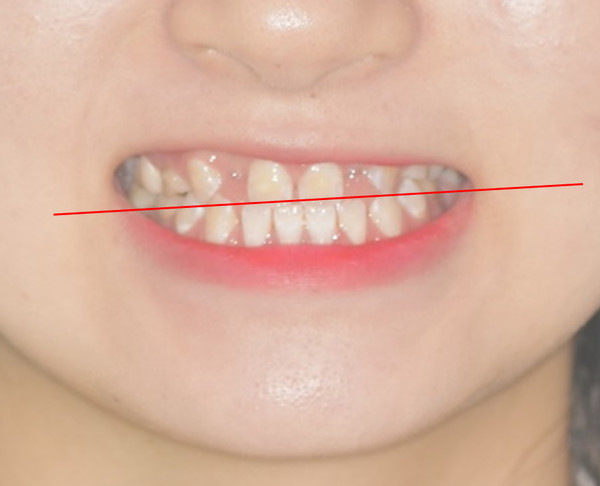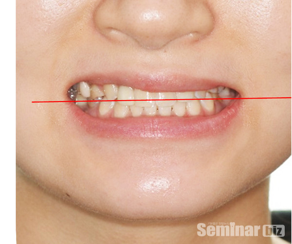 상악 양측 견치의 수직적 위치가 다른 것을 알 수 있습니다. 이는 추후 교정치료가마무리되면 전치부 교합평면의 canting이 확연히 보이게 되므로 문제가 될 수 있습니다.