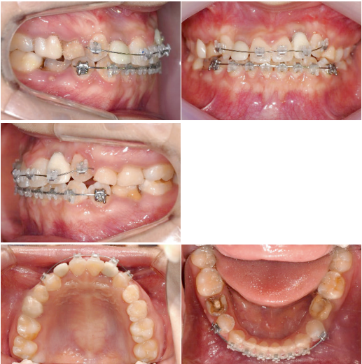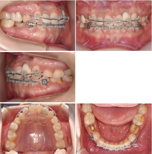 Occlusal canting을 수정하기 위해 상악 좌측 임플란트보철물에 bracket을 기울여 붙여서 slot의 방향대로 archwire가 삽입되었을때 좌측 견치는 정출되고 우측 견치는 함입되도록 하였습니다.
